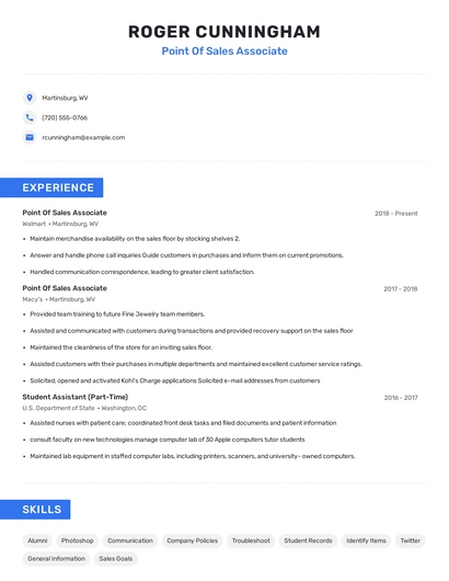 Build a professional point of sales associate resume in minutes. Browse through our resume examples to identify the best way to word your resume. Then choose from 5+ resume templates to create your point of sales associate resume.