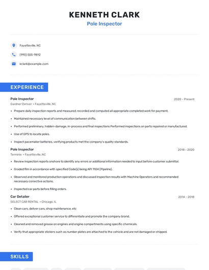 Build a professional pole inspector resume in minutes. Our AI resume writing assistant will guide you through every step of the process, and you can choose from 10+ resume templates to create your pole inspector resume.7. DUG