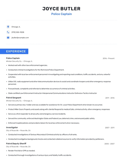 Build a professional police captain resume in minutes. Browse through our resume examples to identify the best way to word your resume. Then choose from 5+ resume templates to create your police captain resume.