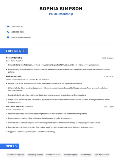 Build a professional police internship resume in minutes. Browse through our resume examples to identify the best way to word your resume. Then choose from 5+ resume templates to create your police internship resume.