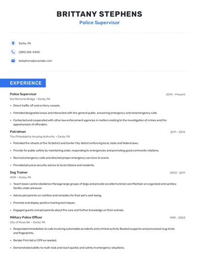 Build a professional police supervisor resume in minutes. Browse through our resume examples to identify the best way to word your resume. Then choose from 5+ resume templates to create your police supervisor resume.