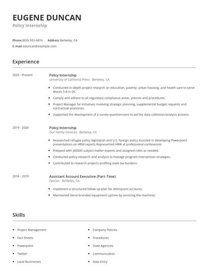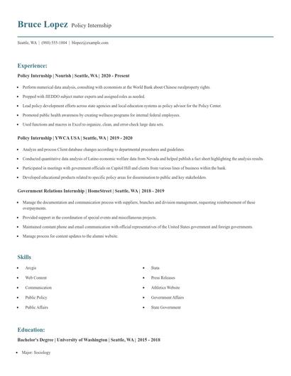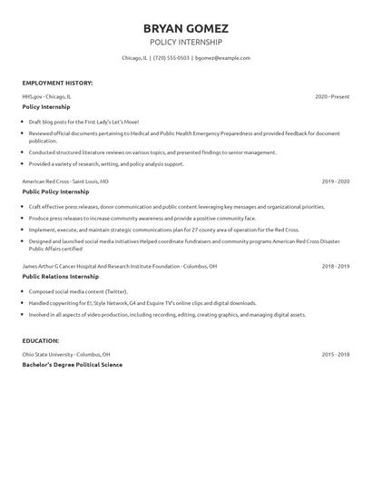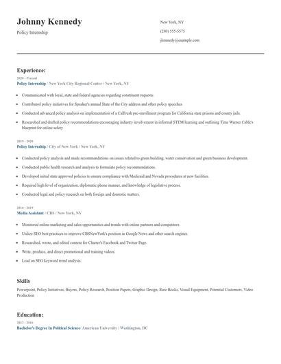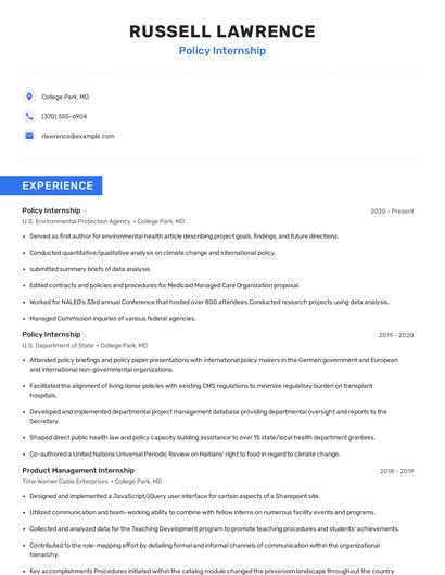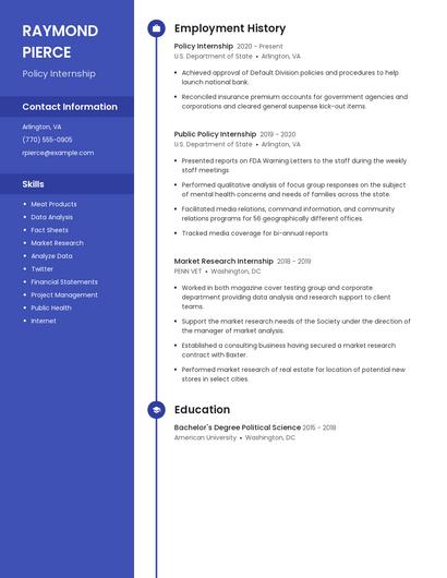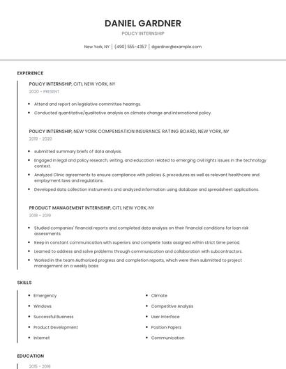 You can use Zippia's AI resume builder to make the resume writing process easier while also making sure that you include key information that hiring managers expect to see on a policy internship resume. You'll find resume tips and examples of skills, responsibilities, and summaries, all provided by Zippi, your career sidekick.