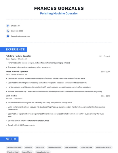 Build a professional polishing machine operator resume in minutes. Our AI resume writing assistant will guide you through every step of the process, and you can choose from 10+ resume templates to create your polishing machine operator resume.7. Unload Trucks