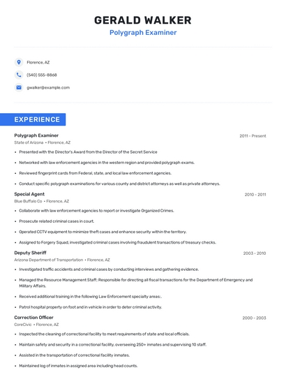 Build a professional polygraph examiner resume in minutes. Our AI resume writing assistant will guide you through every step of the process, and you can choose from 10+ resume templates to create your polygraph examiner resume.7. Law Enforcement Agencies