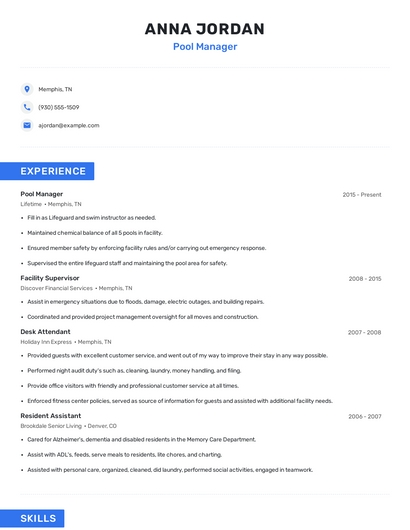 Build a professional pool manager resume in minutes. Browse through our resume examples to identify the best way to word your resume. Then choose from 5+ resume templates to create your pool manager resume.