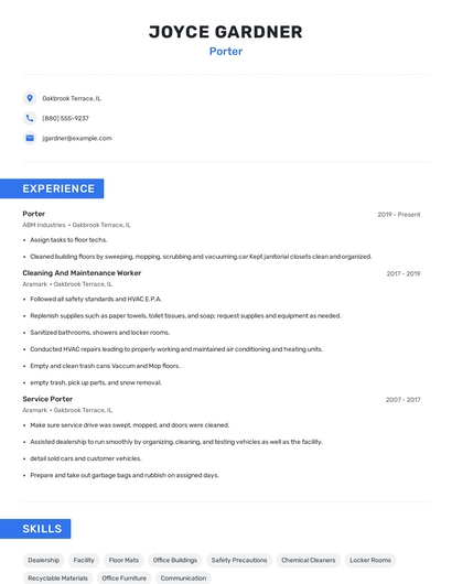 Build a professional porter resume in minutes. Browse through our resume examples to identify the best way to word your resume. Then choose from 5+ resume templates to create your porter resume.