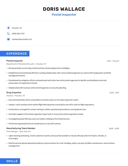Build a professional postal inspector resume in minutes. Browse through our resume examples to identify the best way to word your resume. Then choose from 5+ resume templates to create your postal inspector resume.