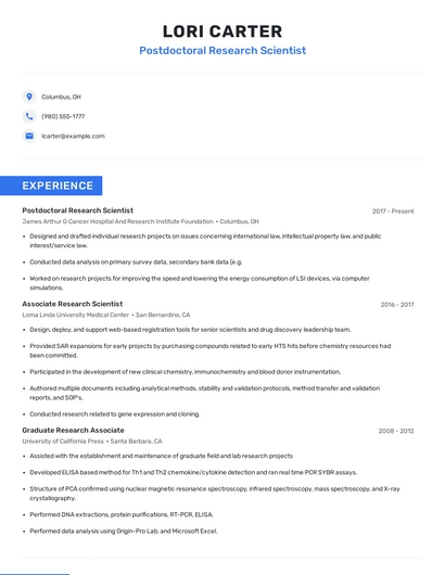 Build a professional postdoctoral research scientist resume in minutes. Browse through our resume examples to identify the best way to word your resume. Then choose from 5+ resume templates to create your postdoctoral research scientist resume.