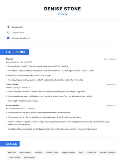 The most important skills for a pourer resume and required skills for a pourer to have include: