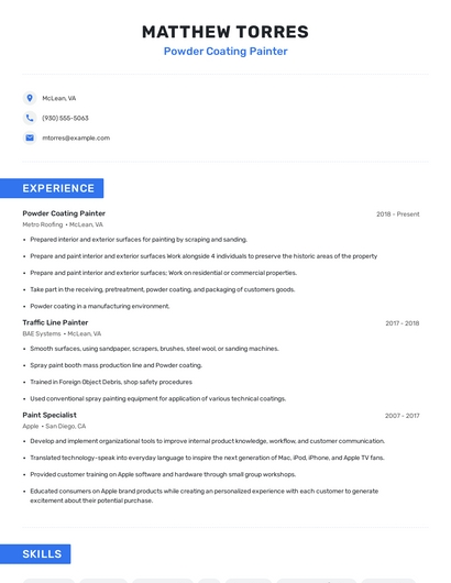 Build a professional powder coating painter resume in minutes. Browse through our resume examples to identify the best way to word your resume. Then choose from 5+ resume templates to create your powder coating painter resume.