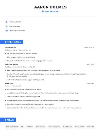 Build a professional power washer resume in minutes. Browse through our resume examples to identify the best way to word your resume. Then choose from 5+ resume templates to create your power washer resume.