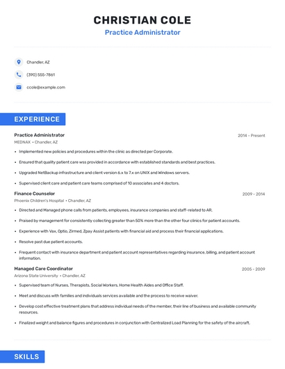 Build a professional practice administrator resume in minutes. Browse through our resume examples to identify the best way to word your resume. Then choose from 5+ resume templates to create your practice administrator resume.