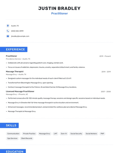 Build a professional practitioner resume in minutes. Browse through our resume examples to identify the best way to word your resume. Then choose from 5+ resume templates to create your practitioner resume.