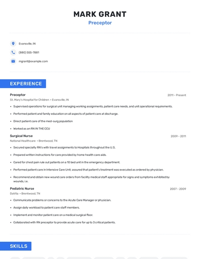 Build a professional preceptor resume in minutes. Browse through our resume examples to identify the best way to word your resume. Then choose from 5+ resume templates to create your preceptor resume.