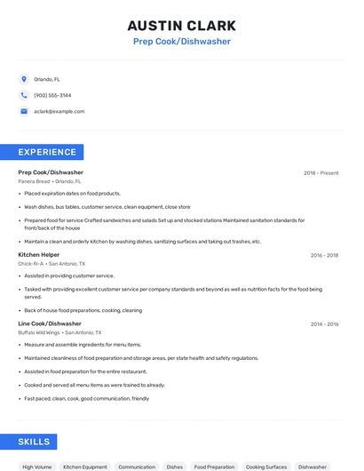 Build a professional prep cook/dishwasher resume in minutes. Browse through our resume examples to identify the best way to word your resume. Then choose from 5+ resume templates to create your prep cook/dishwasher resume.