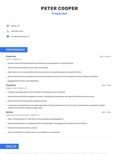 Build a professional preparator resume in minutes. Browse through our resume examples to identify the best way to word your resume. Then choose from 5+ resume templates to create your preparator resume.