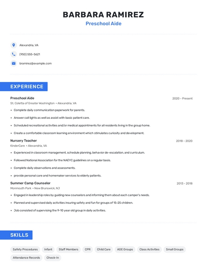 Build a professional preschool aide resume in minutes. Browse through our resume examples to identify the best way to word your resume. Then choose from 5+ resume templates to create your preschool aide resume.