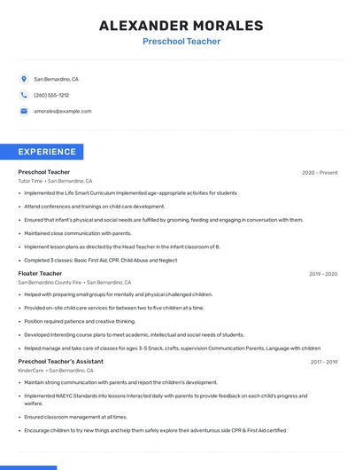 Build a professional preschool teacher resume in minutes. Browse through our resume examples to identify the best way to word your resume. Then choose from 5+ resume templates to create your preschool teacher resume.