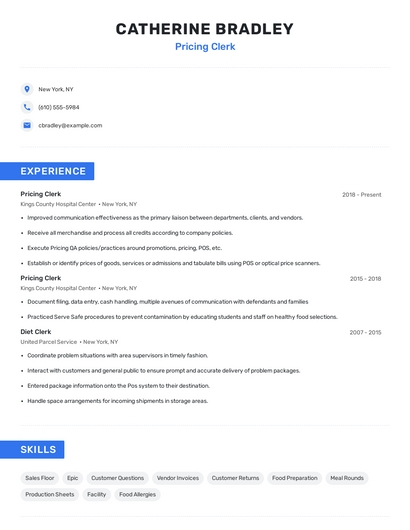 Build a professional pricing clerk resume in minutes. Browse through our resume examples to identify the best way to word your resume. Then choose from 5+ resume templates to create your pricing clerk resume.