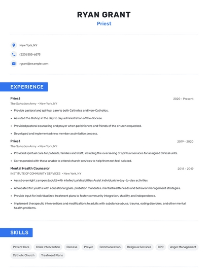 Build a professional priest resume in minutes. Browse through our resume examples to identify the best way to word your resume. Then choose from 5+ resume templates to create your priest resume.