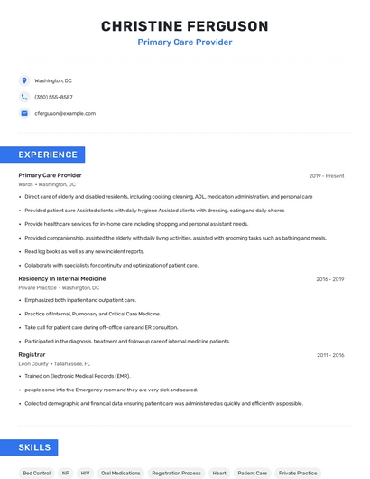 Build a professional primary care provider resume in minutes. Browse through our resume examples to identify the best way to word your resume. Then choose from 5+ resume templates to create your primary care provider resume.