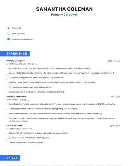 Build a professional primary caregiver resume in minutes. Browse through our resume examples to identify the best way to word your resume. Then choose from 5+ resume templates to create your primary caregiver resume.