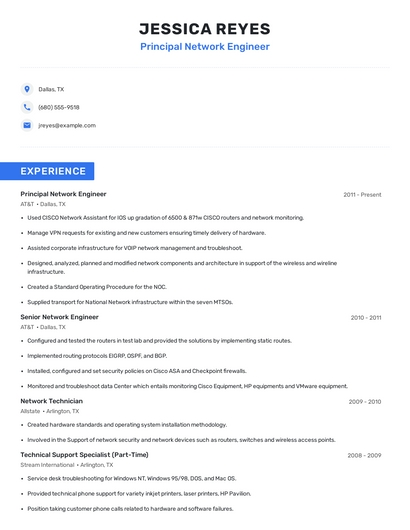 Build a professional principal network engineer resume in minutes. Browse through our resume examples to identify the best way to word your resume. Then choose from 5+ resume templates to create your principal network engineer resume.