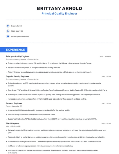 Build a professional principal quality engineer resume in minutes. Browse through our resume examples to identify the best way to word your resume. Then choose from 5+ resume templates to create your principal quality engineer resume.