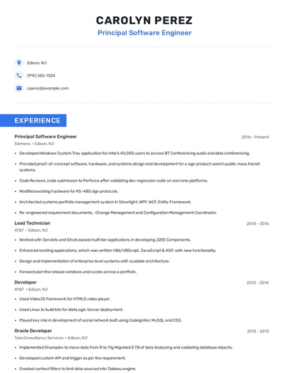 Build a professional principal software engineer resume in minutes. Browse through our resume examples to identify the best way to word your resume. Then choose from 5+ resume templates to create your principal software engineer resume.