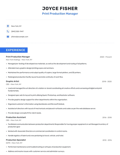 Build a professional print production manager resume in minutes. Browse through our resume examples to identify the best way to word your resume. Then choose from 5+ resume templates to create your print production manager resume.