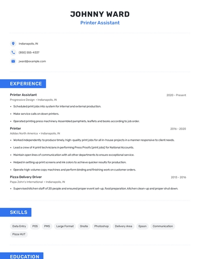 Build a professional printer assistant resume in minutes. Browse through our resume examples to identify the best way to word your resume. Then choose from 5+ resume templates to create your printer assistant resume.
