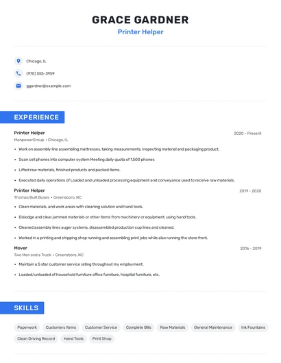 The most important skills for a printer helper resume and required skills for a printer helper to have include: