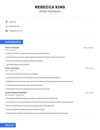 Build a professional printer technician resume in minutes. Browse through our resume examples to identify the best way to word your resume. Then choose from 5+ resume templates to create your printer technician resume.