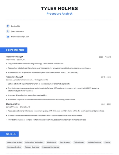 Build a professional procedure analyst resume in minutes. Browse through our resume examples to identify the best way to word your resume. Then choose from 5+ resume templates to create your procedure analyst resume.