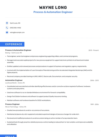 Build a professional process & automation engineer resume in minutes. Browse through our resume examples to identify the best way to word your resume. Then choose from 5+ resume templates to create your process & automation engineer resume.