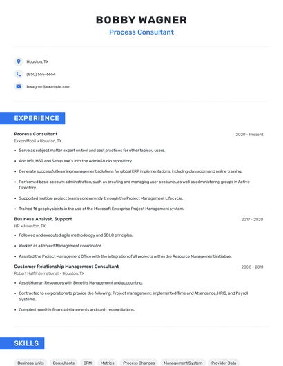 Build a professional process consultant resume in minutes. Browse through our resume examples to identify the best way to word your resume. Then choose from 5+ resume templates to create your process consultant resume.