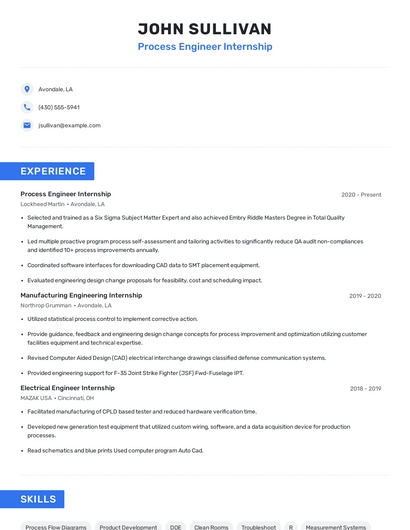 Build a professional process engineer internship resume in minutes. Browse through our resume examples to identify the best way to word your resume. Then choose from 5+ resume templates to create your process engineer internship resume.