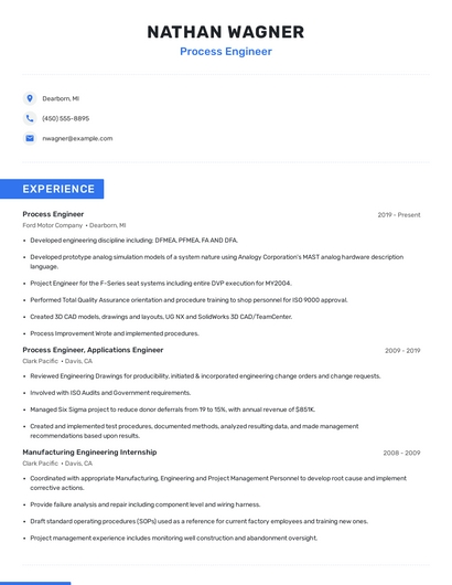 Build a professional process engineer resume in minutes. Browse through our resume examples to identify the best way to word your resume. Then choose from 5+ resume templates to create your process engineer resume.