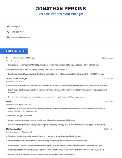 Build a professional process improvement manager resume in minutes. Browse through our resume examples to identify the best way to word your resume. Then choose from 5+ resume templates to create your process improvement manager resume.