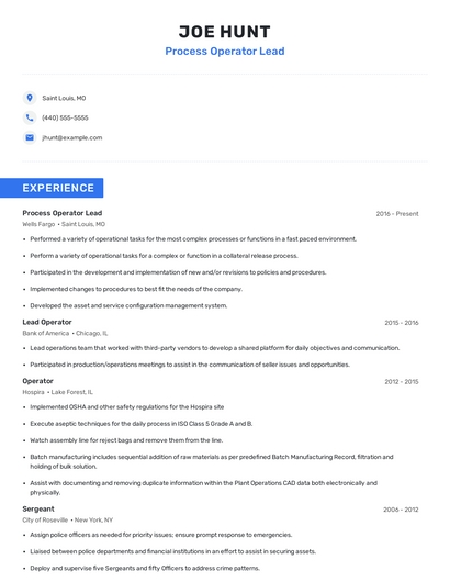 Build a professional process operator lead resume in minutes. Browse through our resume examples to identify the best way to word your resume. Then choose from 5+ resume templates to create your process operator lead resume.
