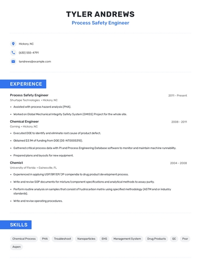 Build a professional process safety engineer resume in minutes. Browse through our resume examples to identify the best way to word your resume. Then choose from 5+ resume templates to create your process safety engineer resume.
