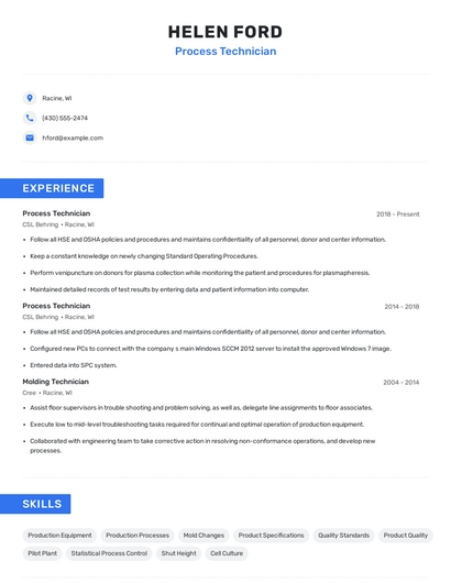 Build a professional process technician resume in minutes. Browse through our resume examples to identify the best way to word your resume. Then choose from 5+ resume templates to create your process technician resume.