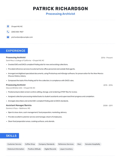 The most important skills for a processing archivist resume and required skills for a processing archivist to have include:
