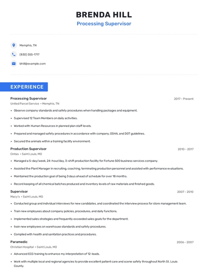 Build a professional processing supervisor resume in minutes. Browse through our resume examples to identify the best way to word your resume. Then choose from 5+ resume templates to create your processing supervisor resume.