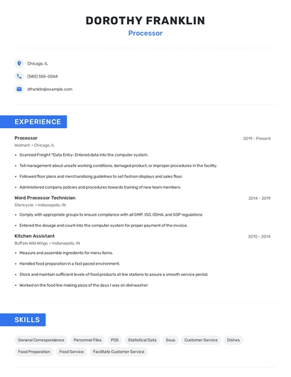 Build a professional processor resume in minutes. Browse through our resume examples to identify the best way to word your resume. Then choose from 5+ resume templates to create your processor resume.