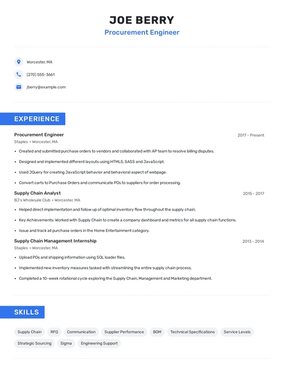 Build a professional procurement engineer resume in minutes. Browse through our resume examples to identify the best way to word your resume. Then choose from 5+ resume templates to create your procurement engineer resume.