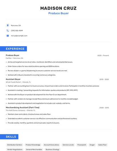 Build a professional produce buyer resume in minutes. Browse through our resume examples to identify the best way to word your resume. Then choose from 5+ resume templates to create your produce buyer resume.