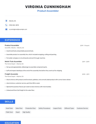 Build a professional product assembler resume in minutes. Browse through our resume examples to identify the best way to word your resume. Then choose from 5+ resume templates to create your product assembler resume.