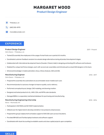 Build a professional product design engineer resume in minutes. Browse through our resume examples to identify the best way to word your resume. Then choose from 5+ resume templates to create your product design engineer resume.