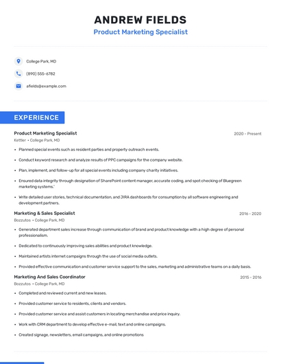 Build a professional product marketing specialist resume in minutes. Browse through our resume examples to identify the best way to word your resume. Then choose from 5+ resume templates to create your product marketing specialist resume.